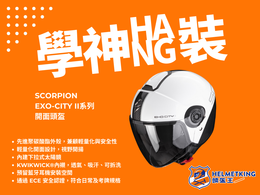 在頭盔選擇方面,套裝提供兩款 Scorpion 人氣型號,分別對應不同學習與使用習慣。EXO-CITY II 系列為開面頭盔,採用先進聚碳酸酯外殼,兼顧輕量化與安全性,開面設計令視野更開揚,特別適合初學者在低速練習時建立空間感與信心。內建下拉式太陽鏡,能應付不同光線環境,而 KwikWick® 內襯具備良好透氣與吸汗能力,亦可拆洗,適合香港氣候。