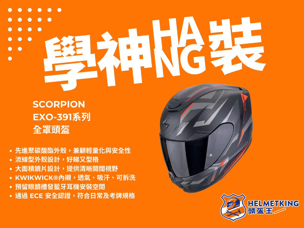偏好較安全的全罩設計新手,則可選擇 EXO-391 系列。其流線型外殼設計,在提供完整包覆的同時,保持良好視野與佩戴舒適度,同樣配備 KwikWick® 內襯系統,長時間學習亦不易造成悶熱不適。兩款頭盔均通過 ECE 安全認證,完全符合學電單車及考牌要求,一步到位避免日後重複購買。