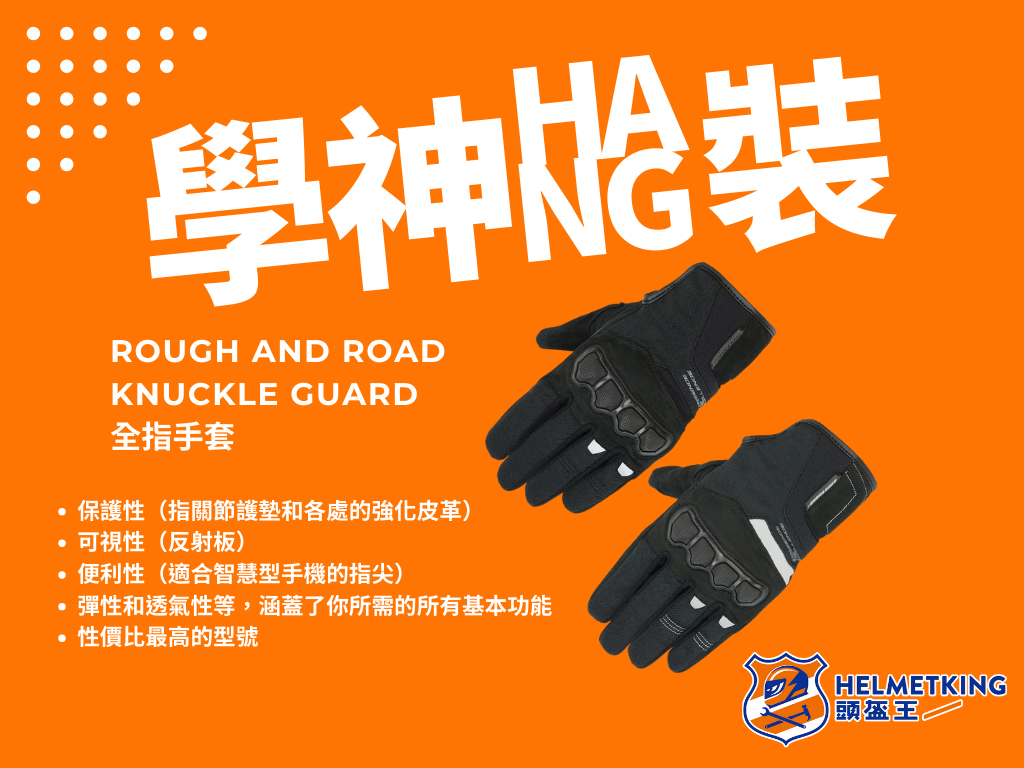 學電單車時,手部操控是最直接影響學習表現的關鍵。套裝內的 Rough & Road 全指手套,設計重點並非厚重防護,而是平衡靈活度與基本保護。內置護拳結構,為新手提供必要防護,同時保持良好手感,讓油門與煞車操作更精準。全指設計亦符合學院對新手裝備的基本要求。